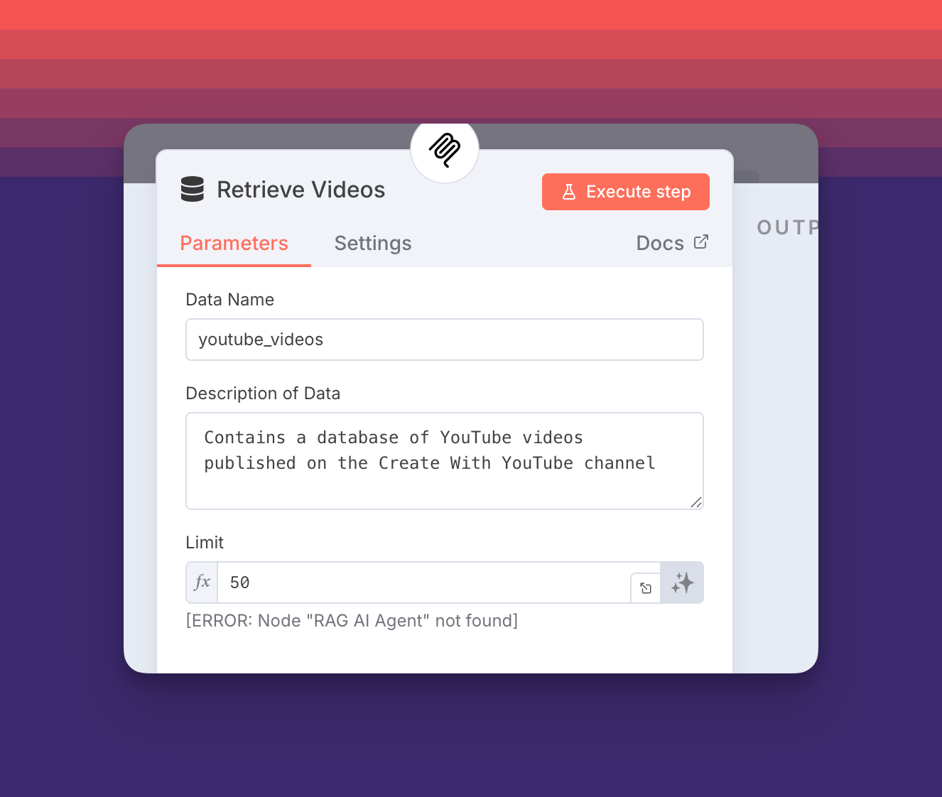 We're using a Supabase vector store for our RAG (Retrieval Augmented Generation) database, but you could use any data source n8n supports.