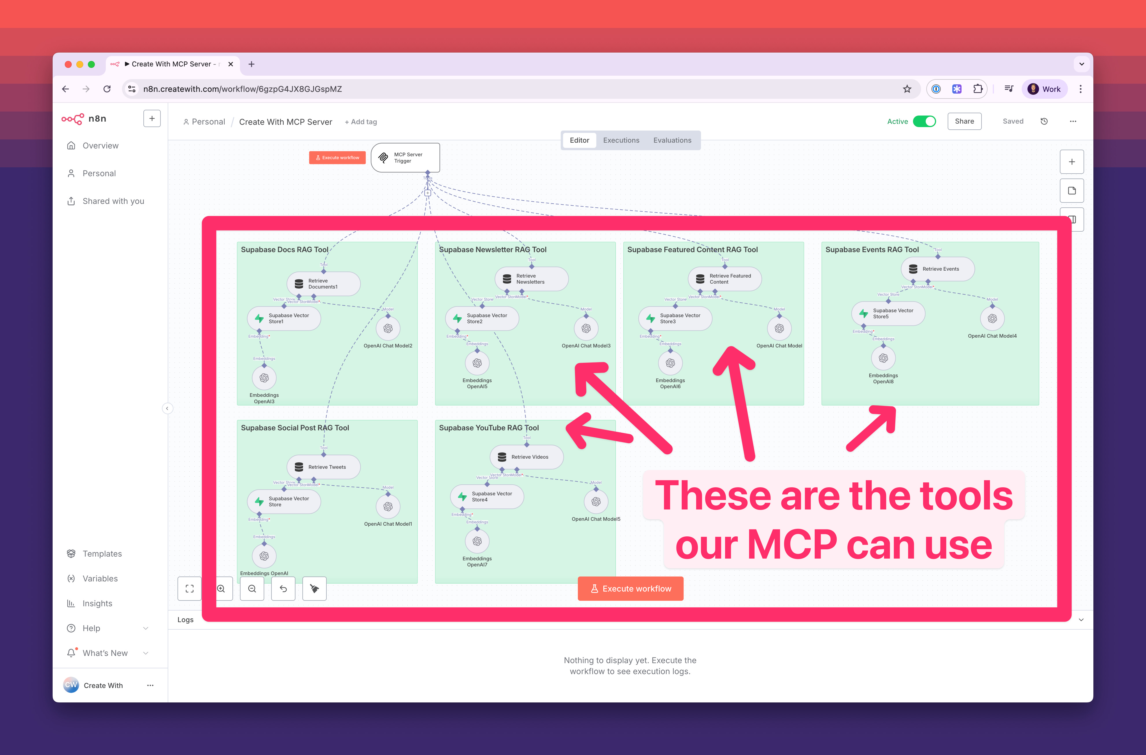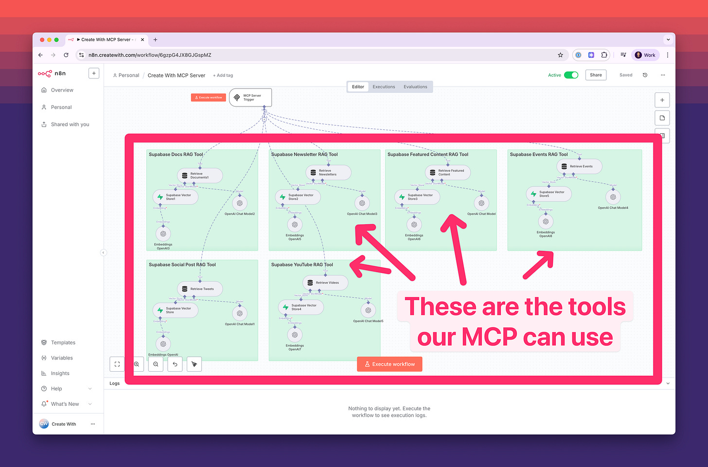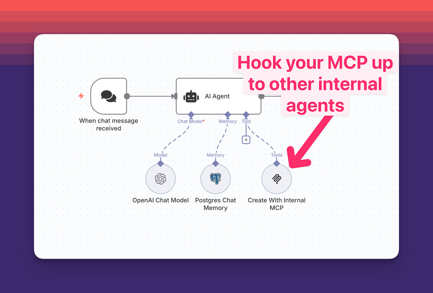 Keep your tools organized: Once you build an MCP server in n8n, you can reuse those same tools from any workflow or AI agent. It becomes part of your company's AI operating system. You only have to update it one place.