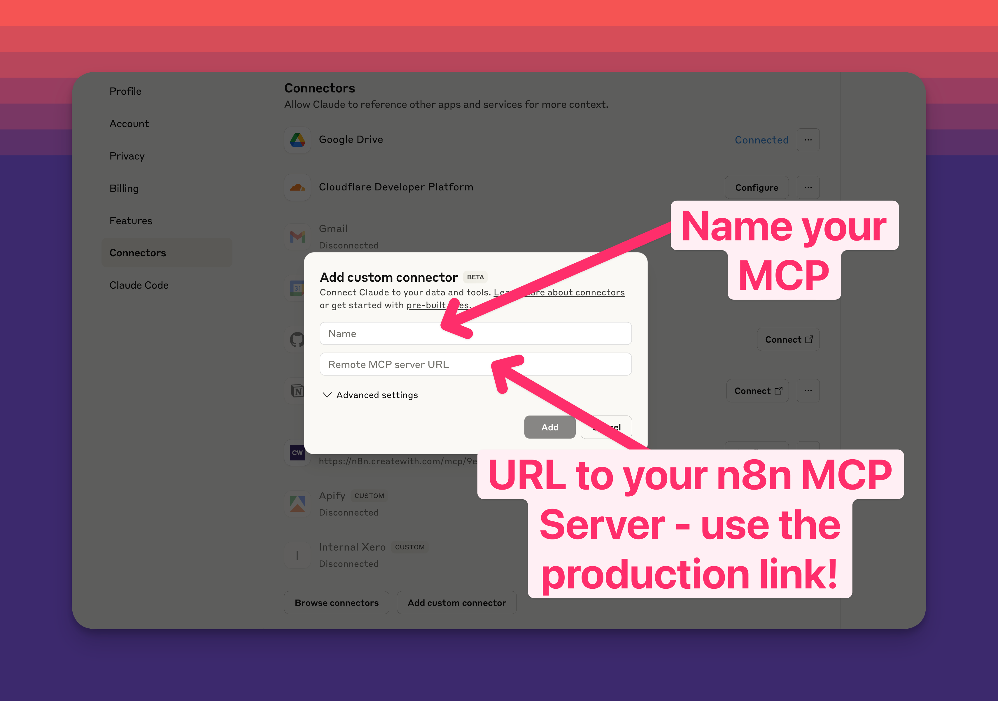 Paste in your MCP server URL from Step 1 - make sure you use the production URL!