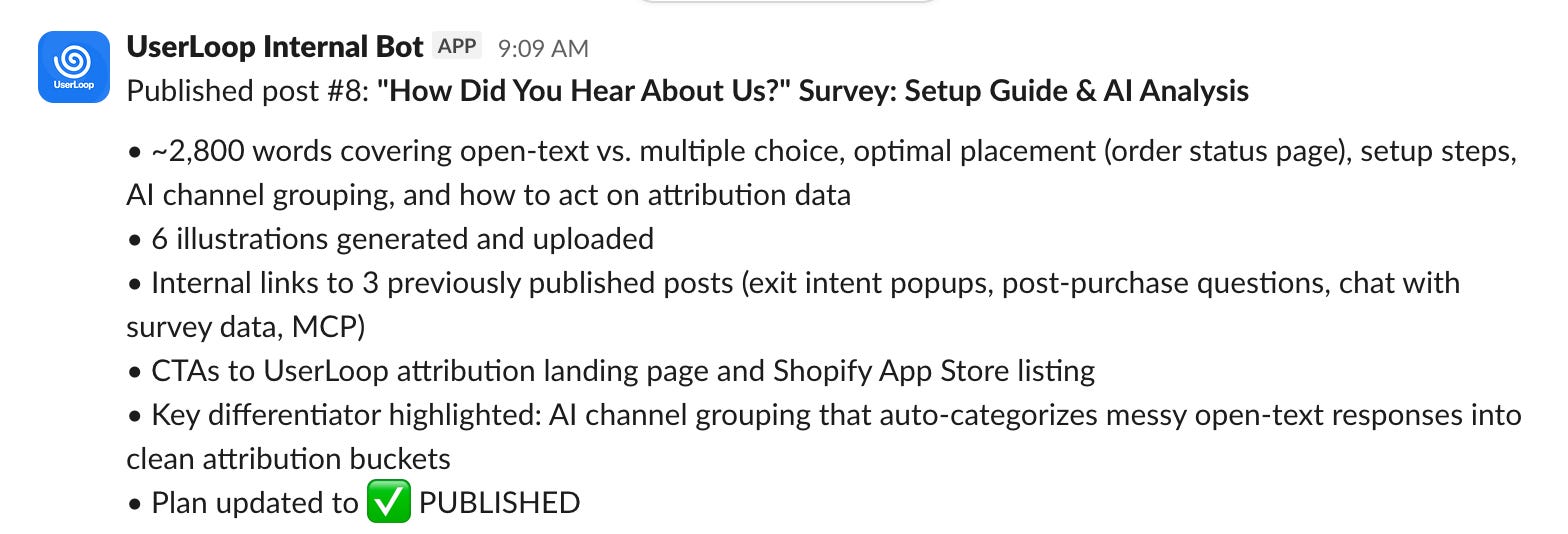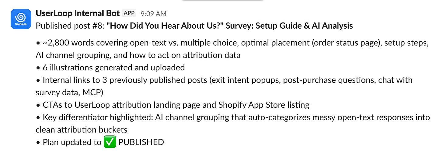 It then writes the posts, generates images for them using Gemini and posts them into Slack for my approval, I can either add a ✅ emoji and the post will be published or request changes.