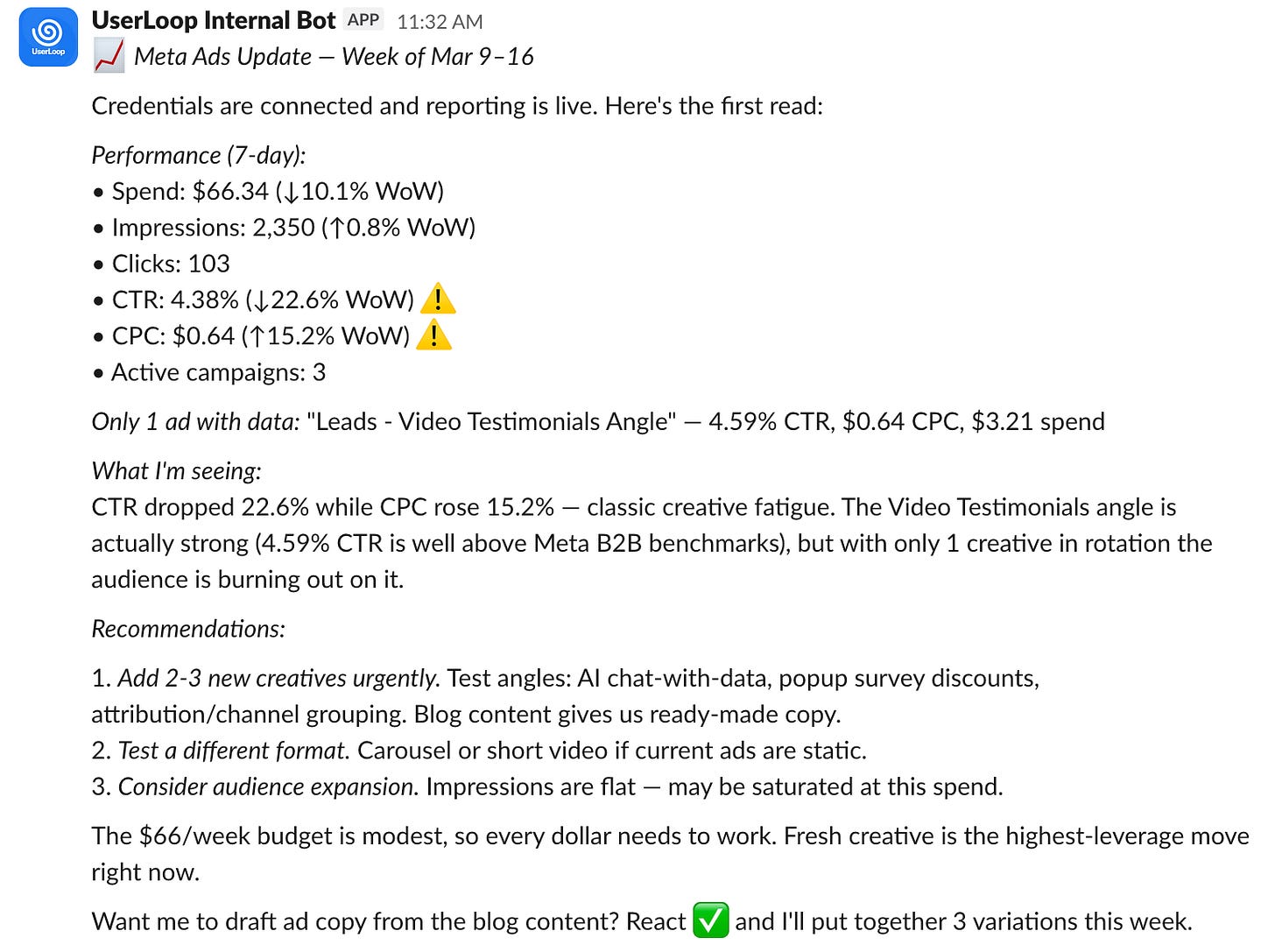 It’s been working amazingly well for me so far! I get a daily report delivered into my Slack marketing channel of how each ad is performing and where to make adjustments, I can even chat back with the bot if needed so I’m finding I never even look at the OpenClaw UI.
