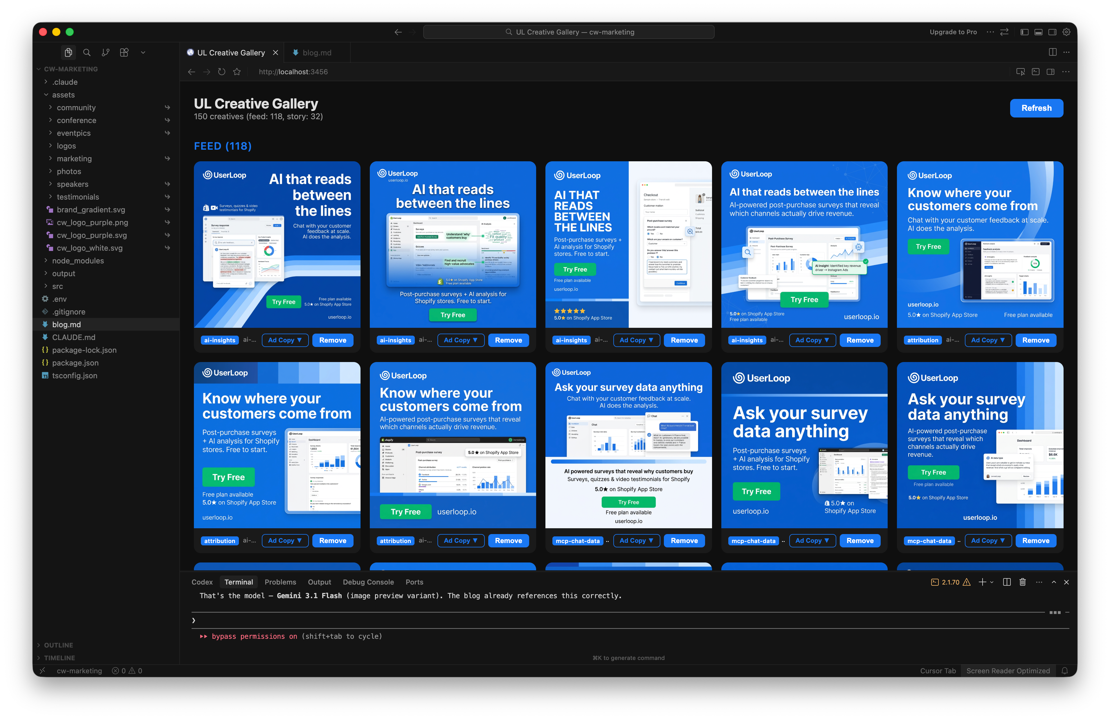 “Build a simple local gallery web page that shows all the generated images in a grid. Include a delete button on each one so I can quickly remove any ads I don’t want to use. Group them by topic and persona so I can see the full range.”