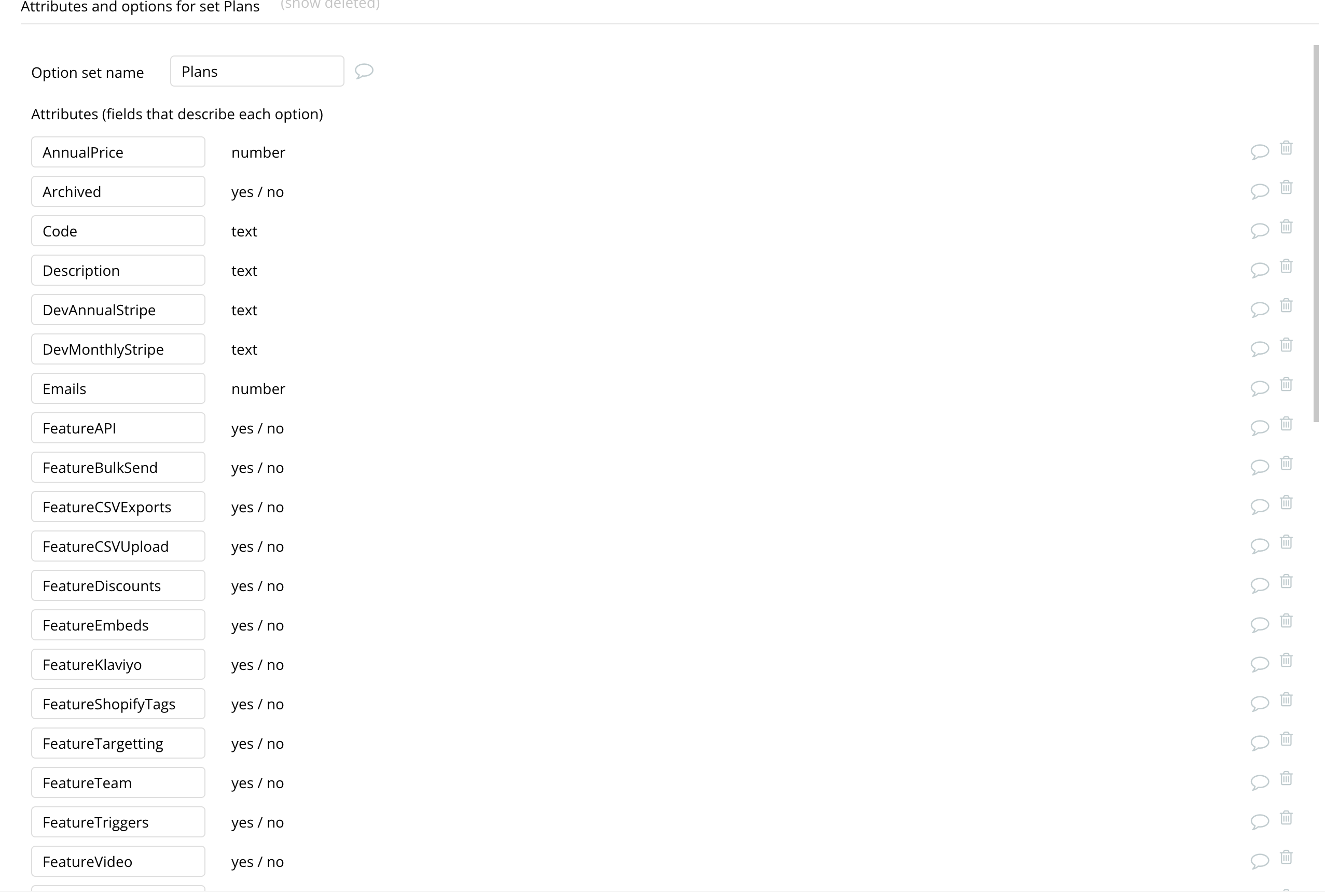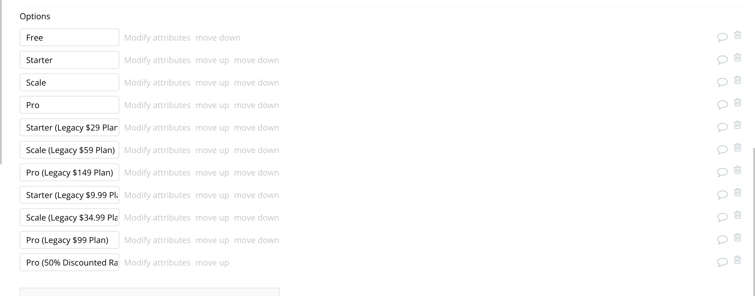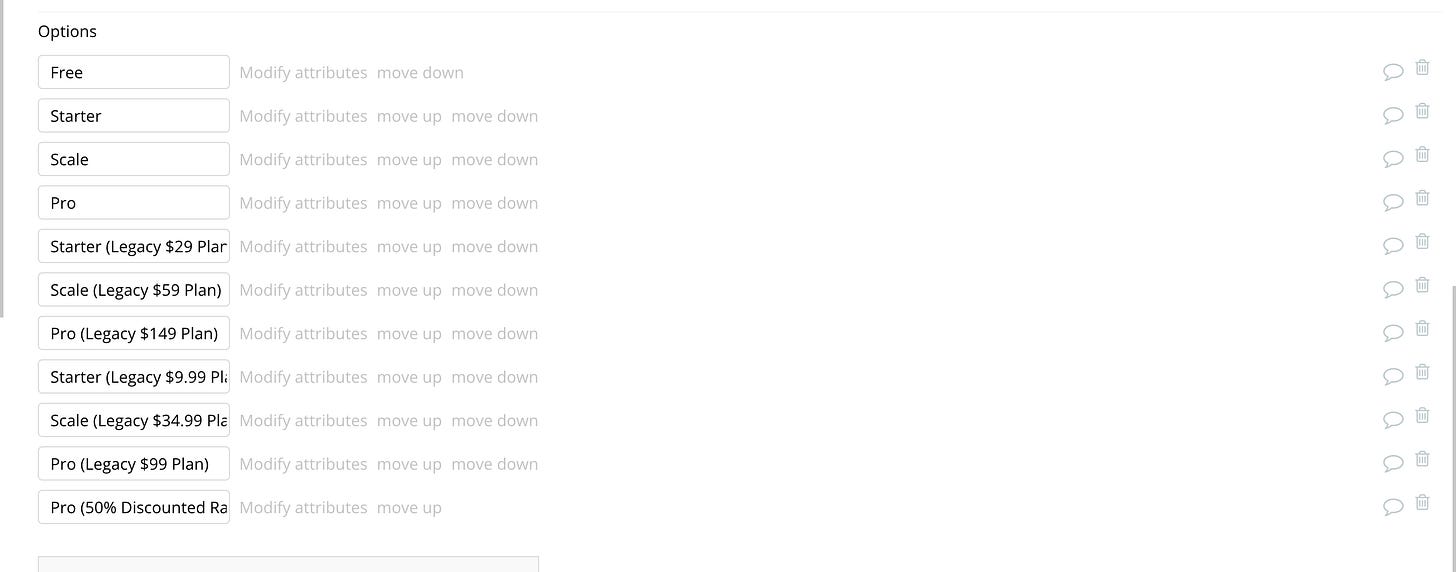 You’ll notice there are a ton of legacy plans, these are plans which are no longer offered to new customers but can still be used by existing customers. Keeping everything in option sets makes this easy to organize.
