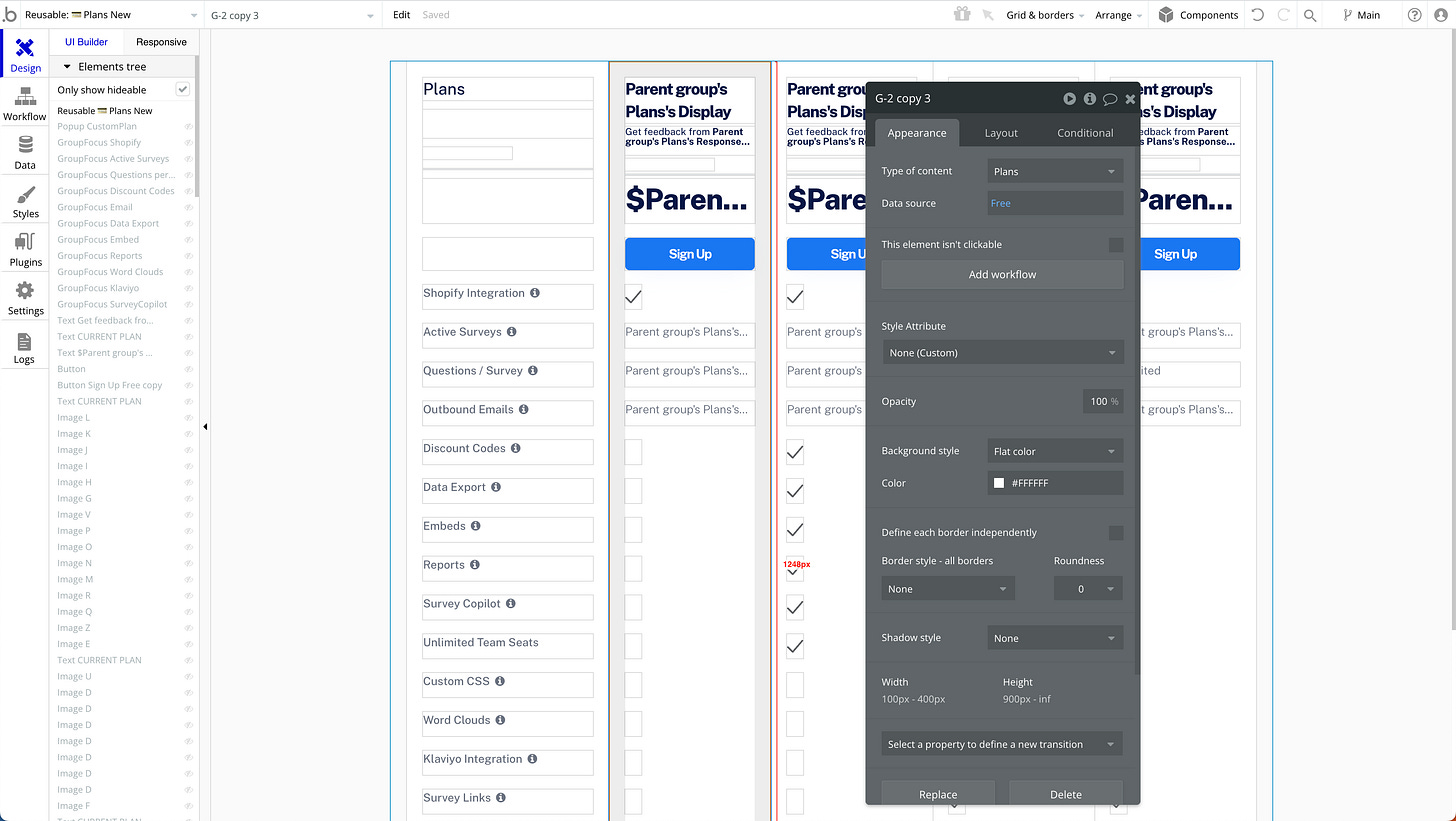 As you can see, each column has a Type of content of Plan which refers to our option set. We then add a new column for every plan we offer and set the data source for the column of the plan you want to show. You then just have to make sure all the data in the column is referring to it’s parent.