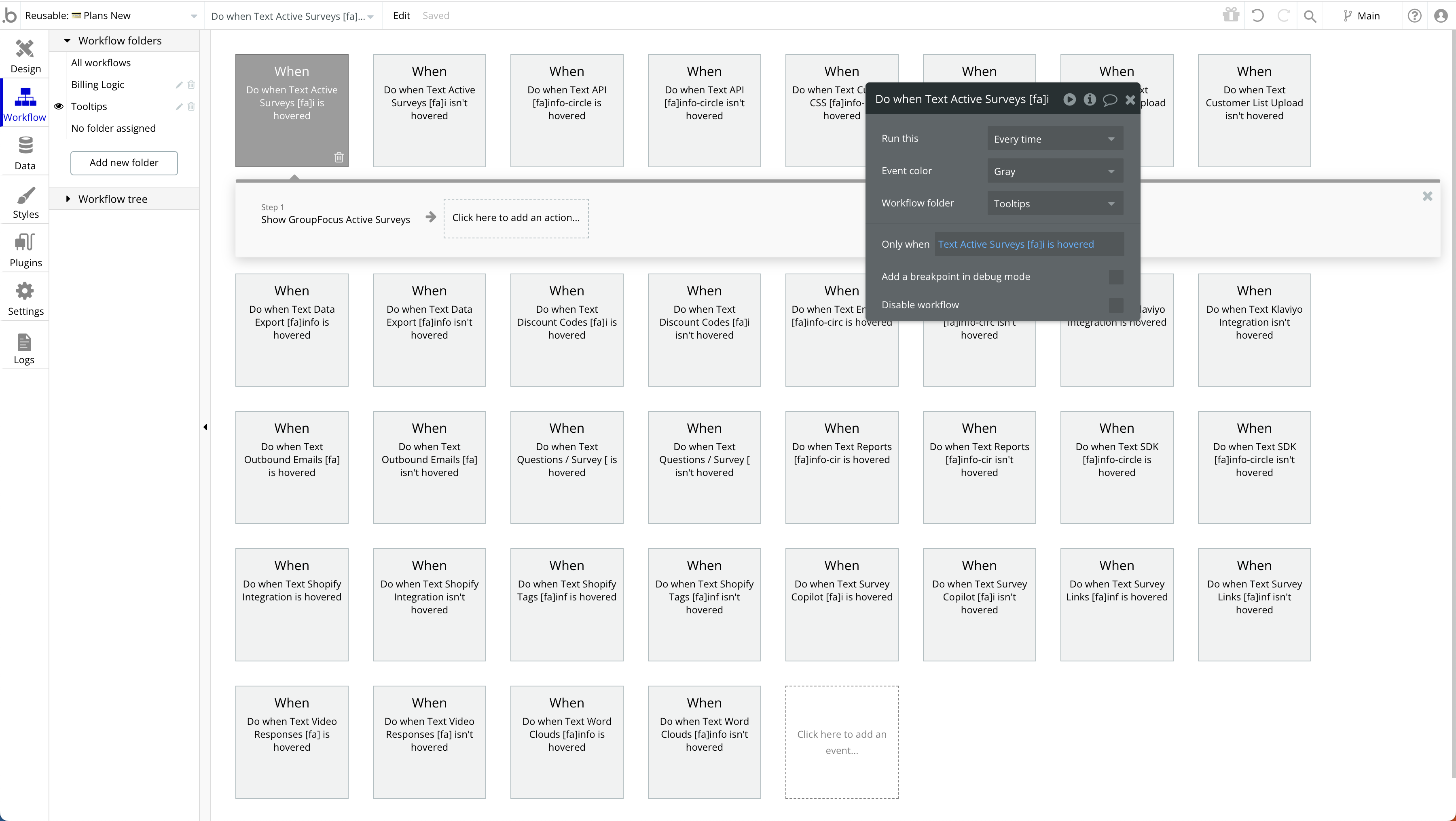 Feature Toggles. You’ll notice lots of feature toggles for individual features in the app, these control whether a given plan is able to access that feature. So in the front-end and back-end logic we can check whether Current User’s Plan FeatureAPI is yes or no, and if it is included in their plan let them use it.
